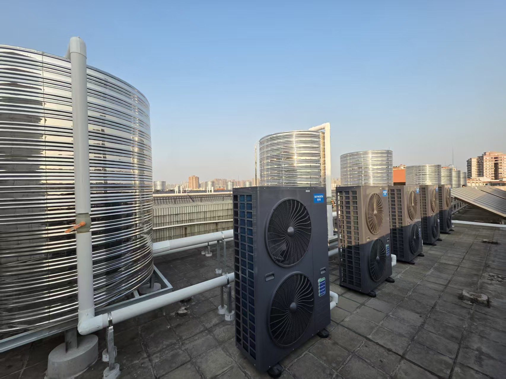 该项目采用“空气能+太阳能”双能互补方案:17台创维空气能热泵机组与320张太阳能板协同工作,配合180吨超大保温水箱,确保热水供应稳定充足。太阳能优先吸收免费热能,空气能机组在阴雨天或用水高峰自动补充,实现全年全天候恒温热水。技术层面,机组搭载全直流变频压缩机和变频电机,可根据用水负荷自动调节运行频率,用水低谷时低频节能,高峰时高频速热,能效远超国家标准,为学校大幅降低运行成本。